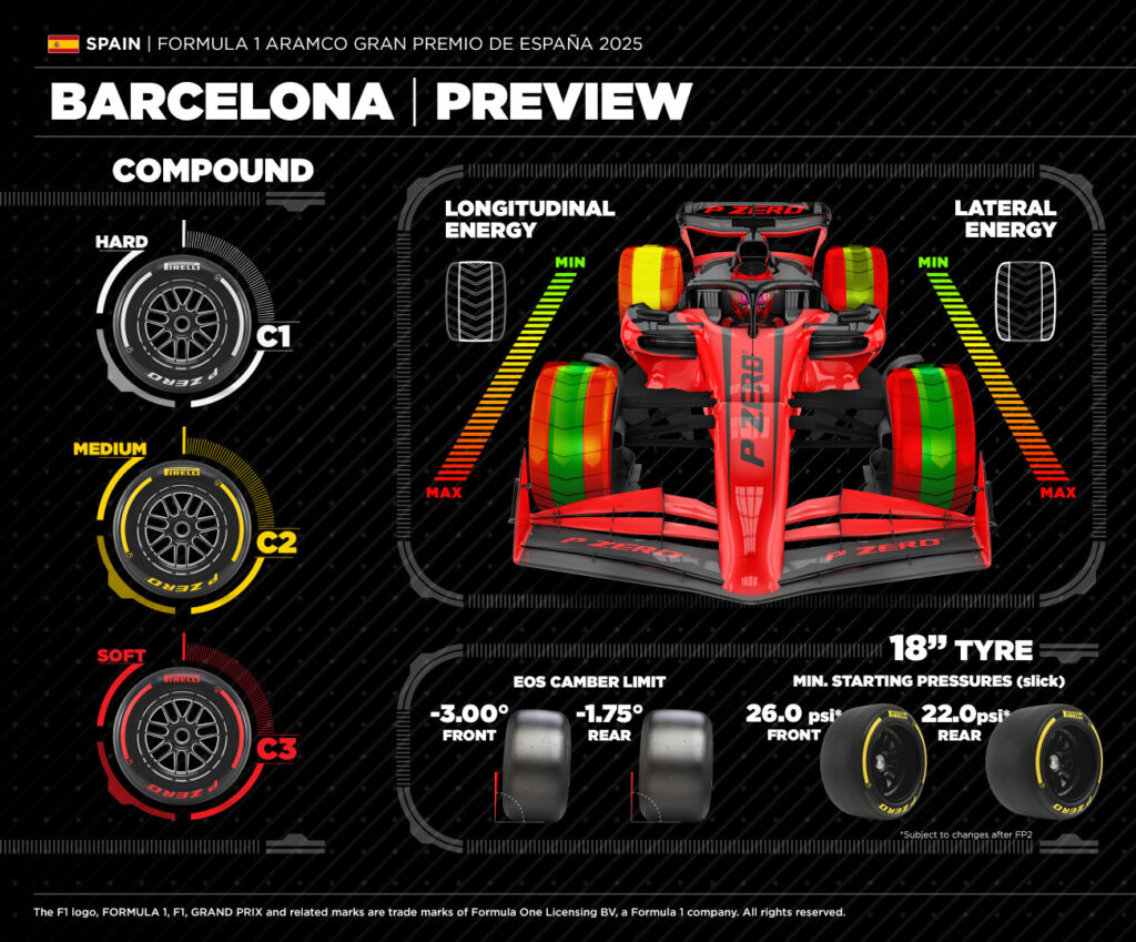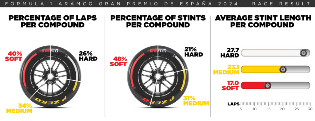 Desde hace años, la estrategia a dos paradas se da por sentada en Montmelò y la carrera del año pasado no fue una excepción. Todos los pilotos, con la excepción de Alex Albon que salía desde el pit lane con el Medium, se alinearon en la parrilla con el Soft para el primer stint. Los tres compuestos disponibles fueron utilizados por 12 pilotos, dejando el Hard para el último stint, mientras que los tres primeros clasificados −el ganador Max Verstappen seguido de Lando Norris y Lewis Hamilton− estaban en un segundo juego de Softs cuando tomaron la bandera a cuadros.