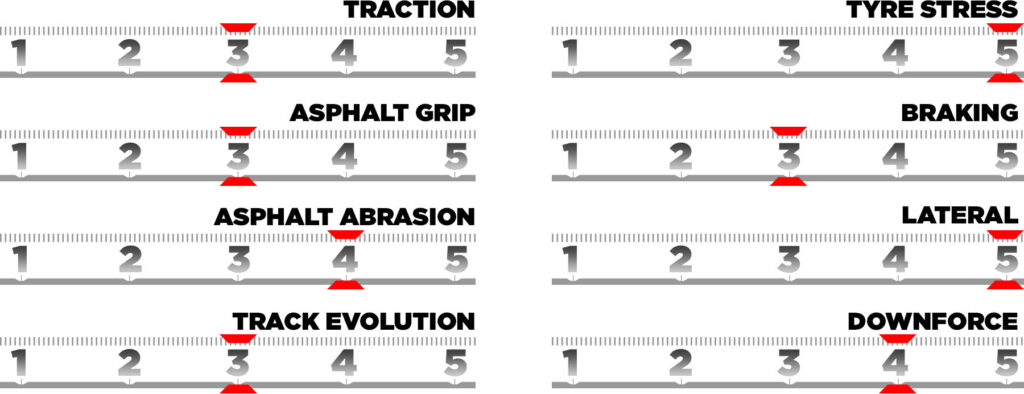 Las fuerzas ejercidas sobre los neumáticos son de medias a altas, debido a las numerosas curvas rápidas, como la curva 3 y las dos finales, ambas a derechas. La curva del coche sometida a mayor estrés es la delantera izquierda, ya que las curvas a derechas son mayoría.