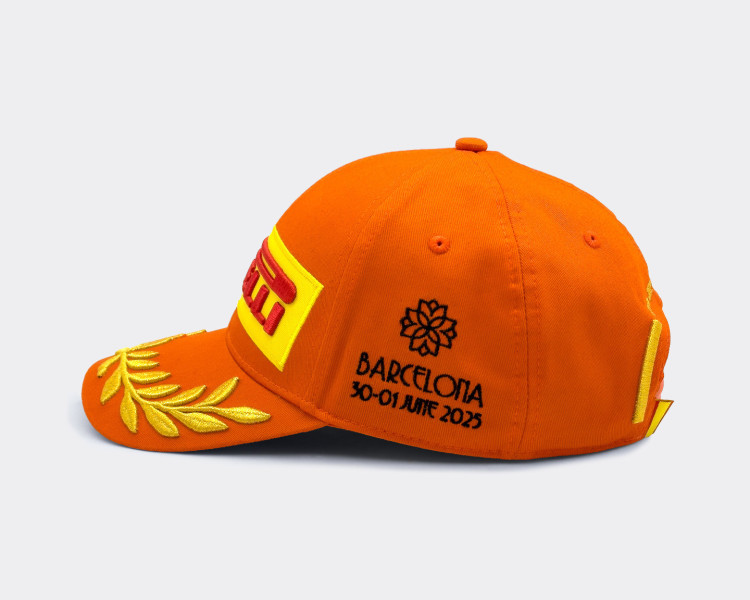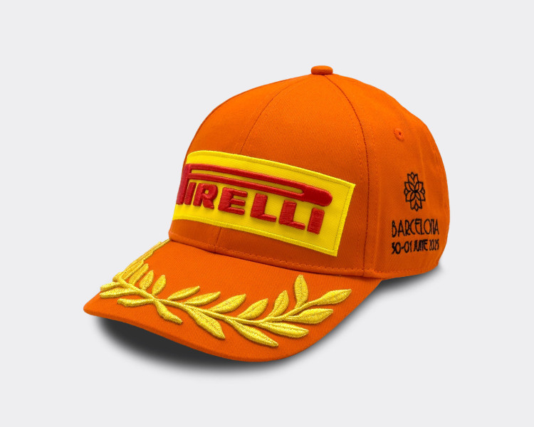 Los pilotos que suban al podio del Gran Premio de España lucirán una edición especial de la clásica gorra Pirelli Podium Cap, diseñada por Denis Dekovic y de color naranja, inspirada en el soleado paisaje de la región catalana. Se trata de la sexta versión de la Gorra Podium presentada este año por Pirelli Design y ya está a la venta en la plataforma dedicada al comercio electrónico.