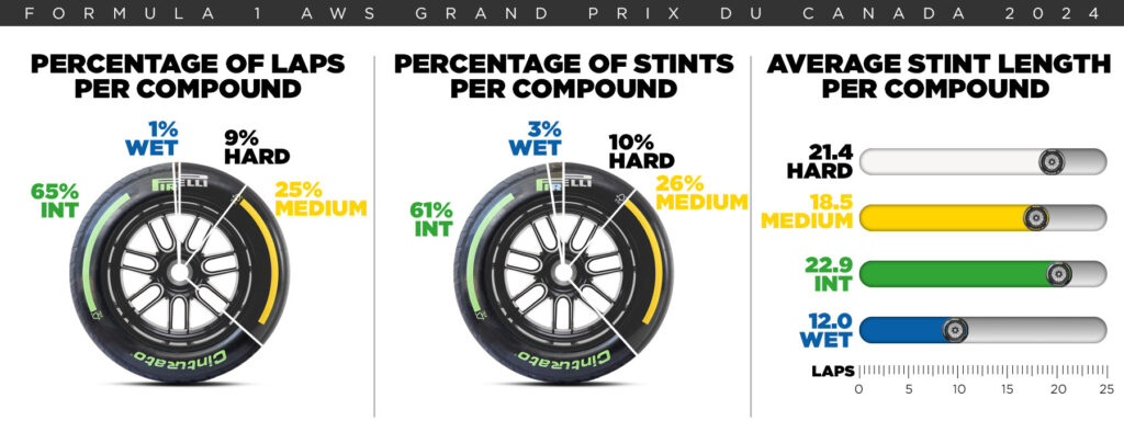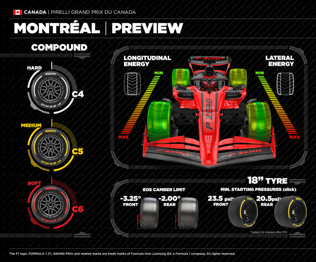 Este fin de semana, al usar el nuevo C6, los equipos y pilotos podrán apoyarse en los datos recopilados en sus dos apariciones anteriores. El circuito Gilles Villeneuve ejerce fuerzas laterales de medias a bajas sobre los neumáticos, mientras que las fuerzas longitudinales son algo más exigentes, aunque no excesivamente altas, debido a las fuertes frenadas seguidas de aceleraciones intensas. El asfalto es muy liso, poco abrasivo y solo se utiliza para competición durante el fin de semana del Grand Prix. Es probable que aparezca algo de “graining” durante las sesiones del viernes, pero este debería reducirse a medida que la pista se engoma. Los tiempos de vuelta mejoran rápidamente, no solo de un día a otro, sino incluso dentro de cada sesión.