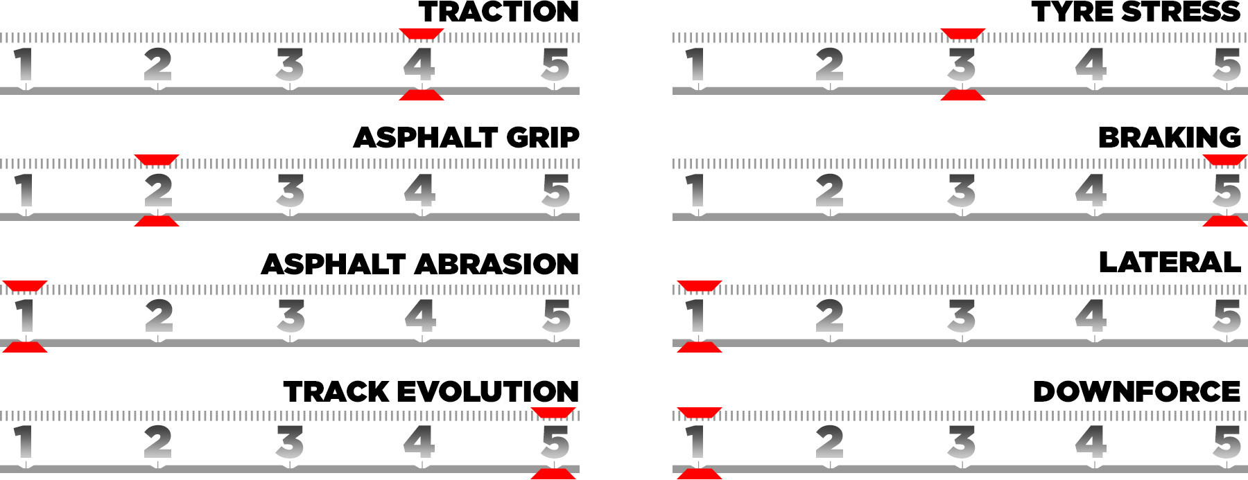 Aunque fue completamente reasfaltado el año pasado, la pista ha mantenido su baja abrasividad y el escaso nivel de agarre que siempre la ha caracterizado. Con 4.361 kilómetros de longitud, presenta una secuencia de rectas y chicanas cerradas, con un total de 14 curvas (seis a la izquierda y ocho a la derecha). Es un trazado de tipo “stop and go”, donde la estabilidad en frenada y la tracción eficiente son esenciales.