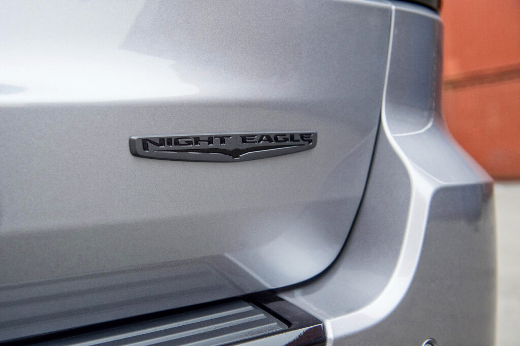 El marco de la parrilla luce en negro Gloss y la textura de la rejilla de la parrilla en Platinum Chrome. Los engastes de los faros y el aplique de la carcasa frontal inferior en negro Gloss aportan al frontal un aspecto único. Las aperturas de luz del día, las placas ‘Jeep’ y ‘4×4’ en negro Gloss, prosiguen con el tema «oscuro» en el exterior del vehículo. El Night Eagle monta neumáticos de 20 pulgadas que rodean a las llantas de aluminio en negro Gloss y refuerzan su aspecto agresivo. El exterior se completa con una placa especial Night Eagle.