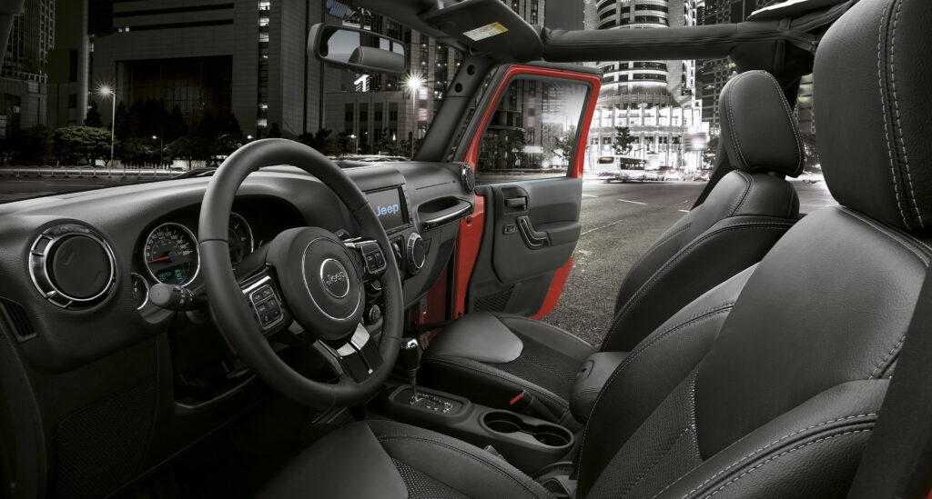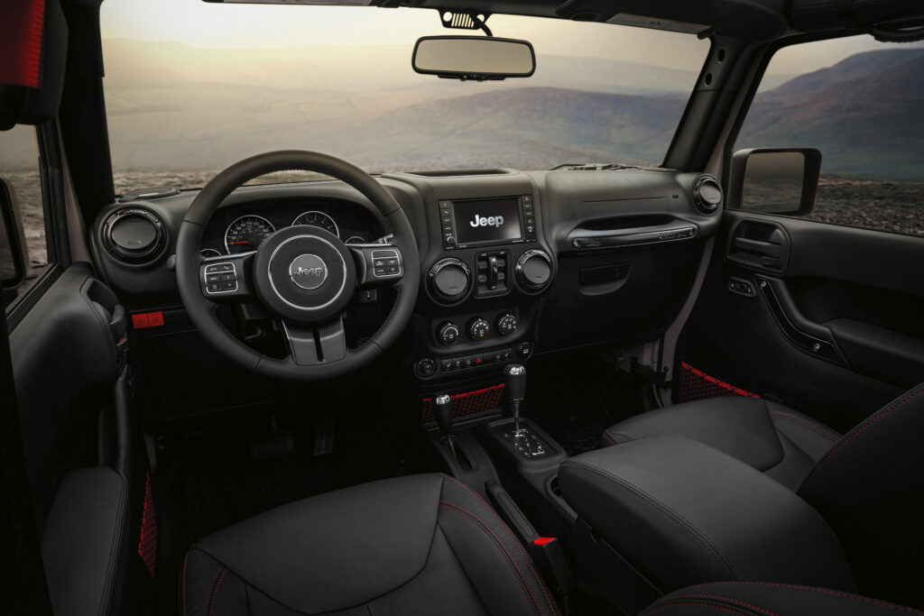 El habitáculo del nuevo Wrangler Rubicon Recon se caracteriza por un colorido rojo y negro. Unas costuras decorativas de color rojo adornan los asientos de cuero calefactados, de serie, con un logotipo bordado «Rubicon». Los apoyabrazos de las puertas delanteras, forrados de vinilo negro, y la tapa de la consola con costuras negras, las redes decorativas rojas en los bolsillos de las puertas delanteras y traseras ayudan a diferenciar el Recon del resto de la gama Wrangler. Un exclusivo volante forrado de cuero con costuras negras y radios con acabado New Midnight Star para resaltar el atractivo característico del nuevo modelo de edición limitada. Una placa en el salpicadero muestra información sobre los ejes delantero y trasero, barra estabilizadora delantera, caja de transferencia y neumáticos.