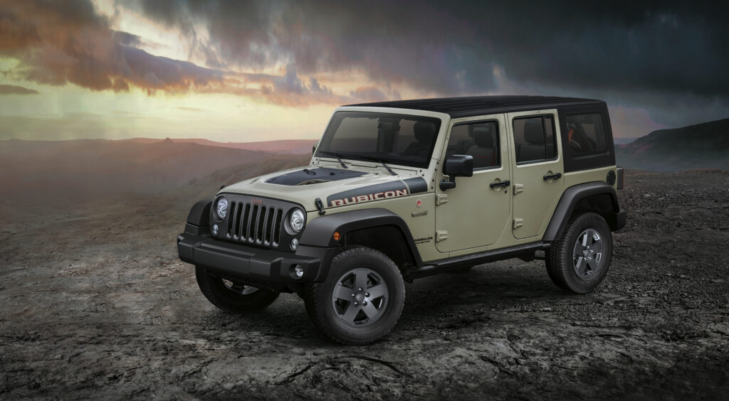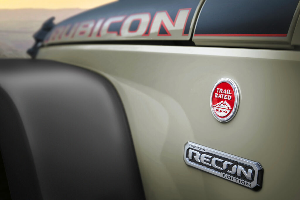 El nuevo modelo de edición limitada Recon presenta varias características que mejoran la fuerte personalidad, la legendaria capacidad 4×4 y la libertad al aire libre del mítico Wrangler; incluye llantas de aluminio de 18 pulgadas pintadas en Low Gloss Granite Crystal, doble techo (es decir que incluye las opciones techo duro y capota de lona), y un capó Power Dome con ventilación doble a ambos lados del cual luce una silueta negra «Rubicon» adhesiva con letras en tonos rojos.