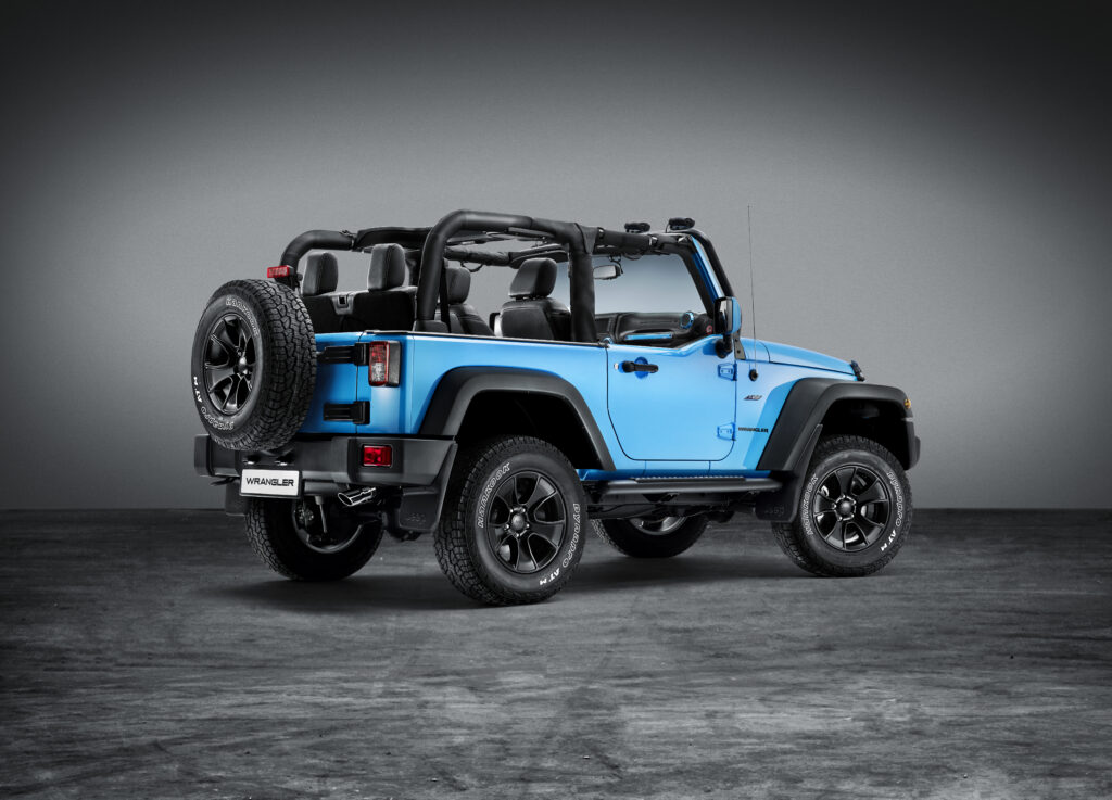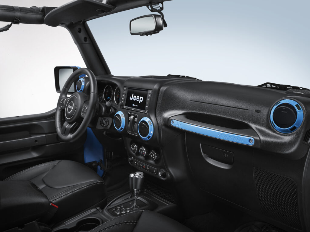 El Jeep Wrangler Rubicon con exterior azul Chief exhibido en Ginebra cuenta con Mopar® ONE, el paquete de personalización especial para todoterreno, de Mopar®, y que incluye accesorios para off-road y kit de elevación homologados por el constructor. Con Mopar® ONE, el ya muy capaz modelo Rubicon entrega unas prestaciones off-road aún mayores. El paquete se puede pedir a partir de marzo e incluye un kit de elevación de 2 pulgadas, un estabilizador de la dirección, llantas de aluminio fundido de 17 pulgadas Performance Gladiator pintadas en negro con grandes neumáticos Hankook Dynapro 265/75 R17, faldillas delanteras y traseras moldeadas, tapa de depósito de combustible en negro y placa Mopar®.