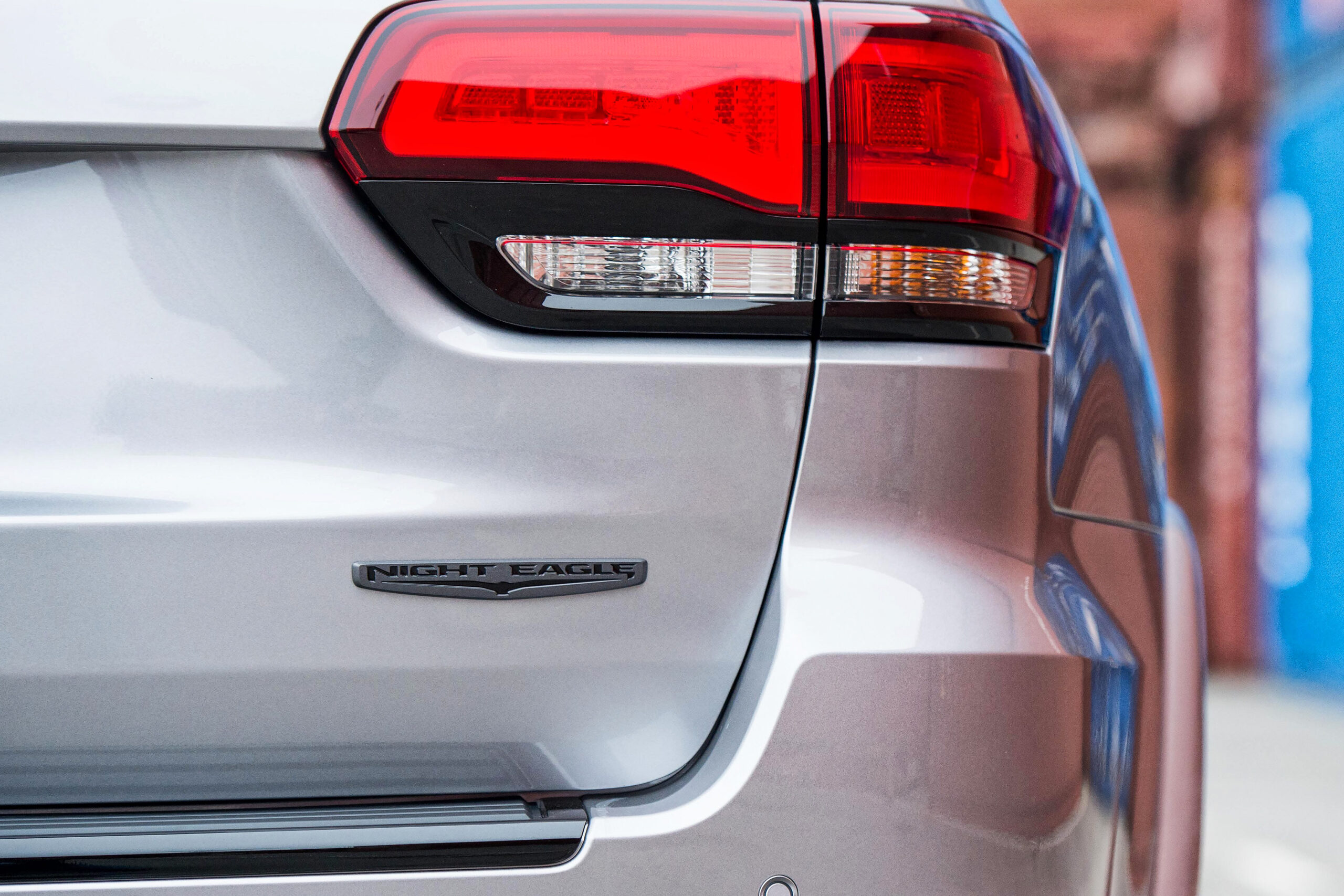 El marco de la parrilla luce en negro Gloss y la textura de la rejilla de la parrilla en Platinum Chrome. Los engastes de los faros y el aplique de la carcasa frontal inferior en negro Gloss aportan al frontal un aspecto único. Las aperturas de luz del día, las placas ‘Jeep’ y ‘4×4’ en negro Gloss, prosiguen con el tema «oscuro» en el exterior del vehículo. El Night Eagle monta neumáticos de 20 pulgadas que rodean a las llantas de aluminio en negro Gloss y refuerzan su aspecto agresivo. El exterior se completa con una placa especial Night Eagle.