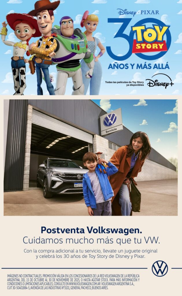 En el marco de la alianza estratégica entre Volkswagen y Disney en nuestro país y el mundo, la marca presenta una nueva campaña pensada para fortalecer la relación con sus clientes y, sobre todo, mejorar la experiencia de quienes confían día a día en Volkswagen. A partir del 15 de octubre y hasta el 30 de noviembre, los clientes que realicen el servicio de mantenimiento de su vehículo en la red oficial Volkswagen y realicen una compra adicional, recibirán gratis un muñeco de la película Toy Story de Disney y Pixar.