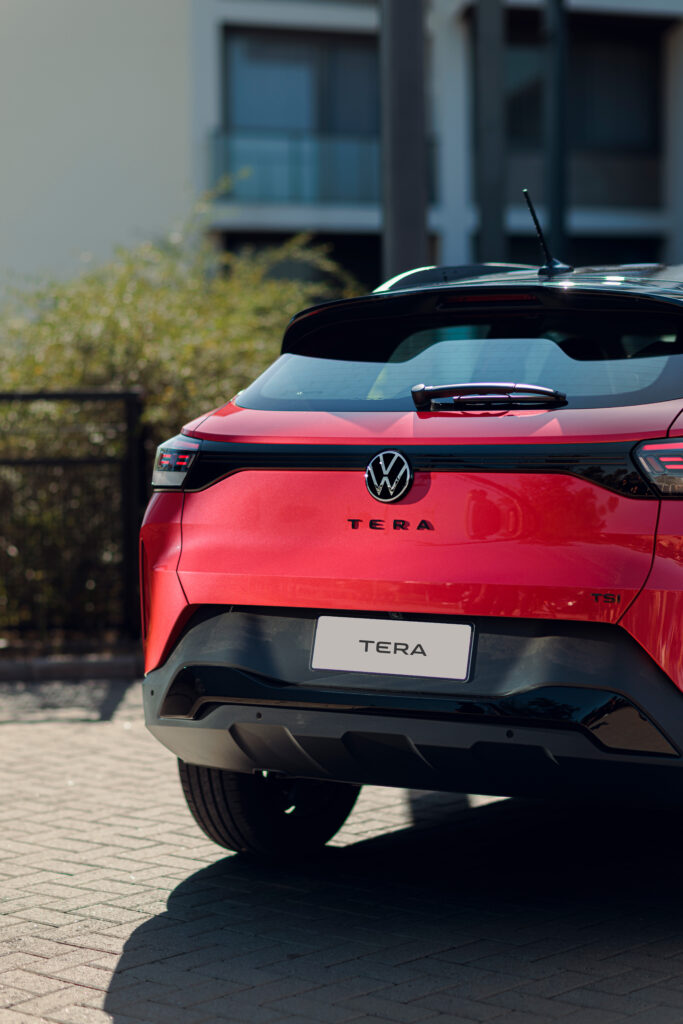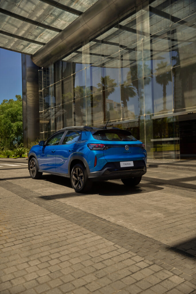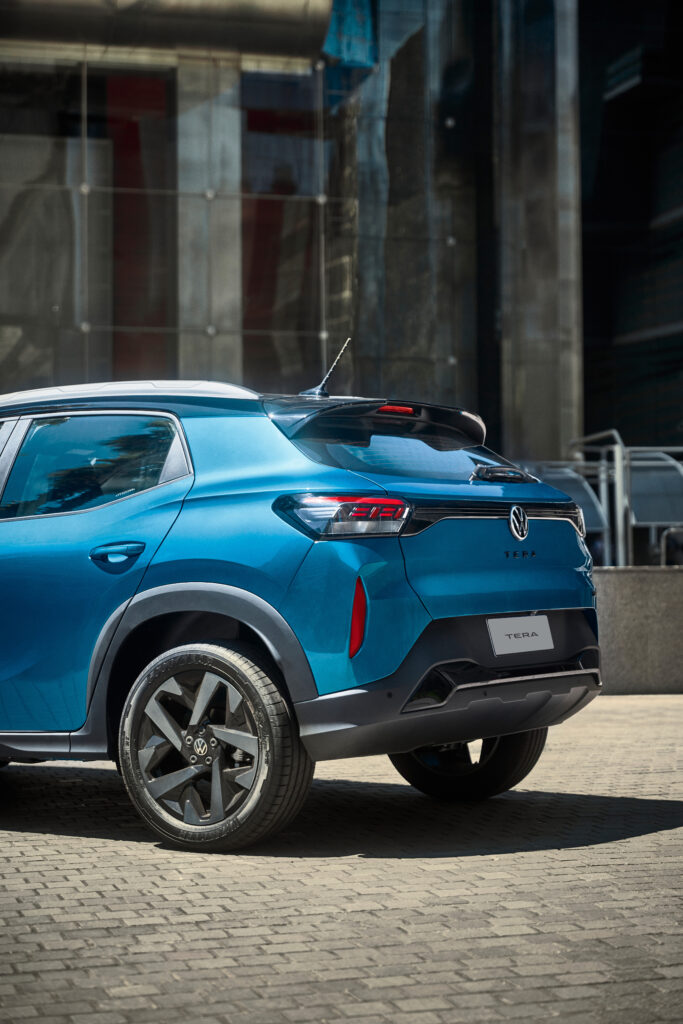 Creado por el equipo liderado por José Carlos Pavone, Head of Design Américas, el Tera estrena una nueva identidad con un estilo único para los modelos Volkswagen, caracterizada por líneas fluidas y una auténtica escultura trasera. Las líneas que se originan en los guardabarros crean una sensación de altura y presencia. Este juego de proporciones no sólo eleva visualmente el modelo, sino que también refuerza la robustez de su estructura, especialmente en la parte delantera, donde se acentúa su aspecto imponente. En la parte trasera, el ensanchamiento de la columna “C” sigue el mismo principio, proporcionando un equilibrio perfecto entre fluidez y robustez. Las ruedas, a su vez, tienen el tamaño preciso para llenar los pasos de rueda, creando armonía entre el volumen de la carrocería y la postura dinámica del vehículo. El techo conserva una inclinación deportiva sin perder las características llamativas de un SUV.